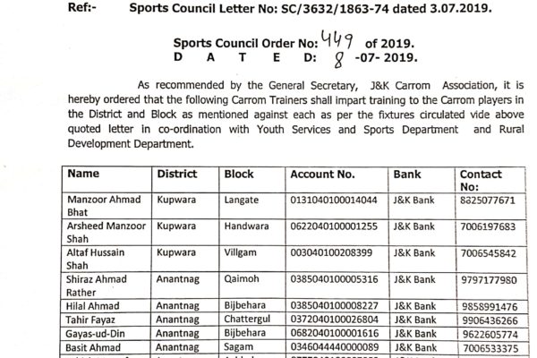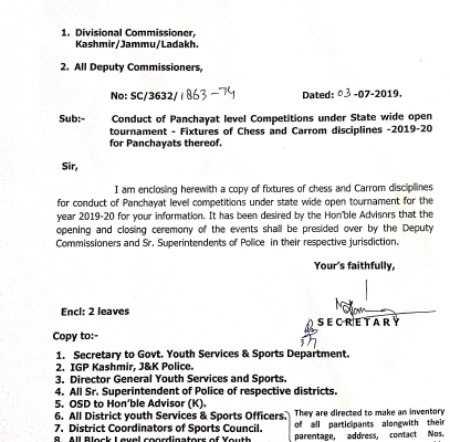 Conduct of panchayat level competitions under state wide open tournament- Fixtures of chess and carrom disciplines- 2019-20 for panchayats thereof. Link here: Conduct