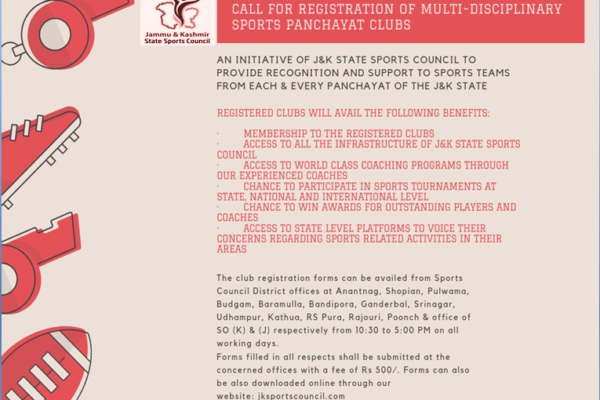 An initiative of J&K State Sports Council to provide recognition and support to sports teams from each & every Panchayat of the J&K State. Download form here: Form Clubs